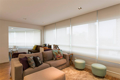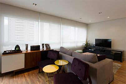 O Home Theater tem uma decoração moderna, com um mix da grande mobília neutra com pequenos móveis de decoração mais coloridos e divertidos, como poltronas roxas, mesinhas amarelas e almofadas estampadas.